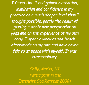 It includes accommodation, all food on site, all tuition. Not included are the flights and the transfers from airport or train station, and, if desired, the rent for a motorcycle or scooter. You can see some pictures at the Gallery page of this website (from September 2010 onwards), and some more information on Sue’s website www.yogaonashoestring.com.